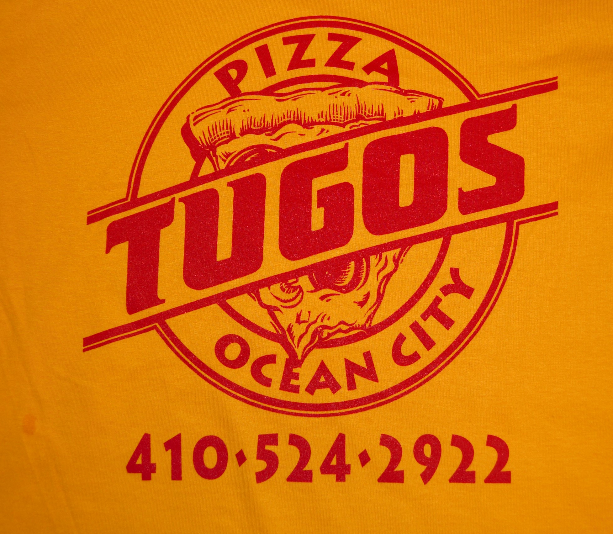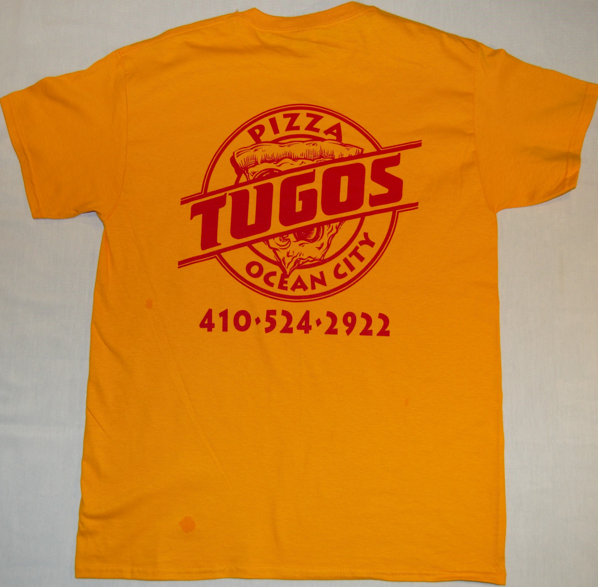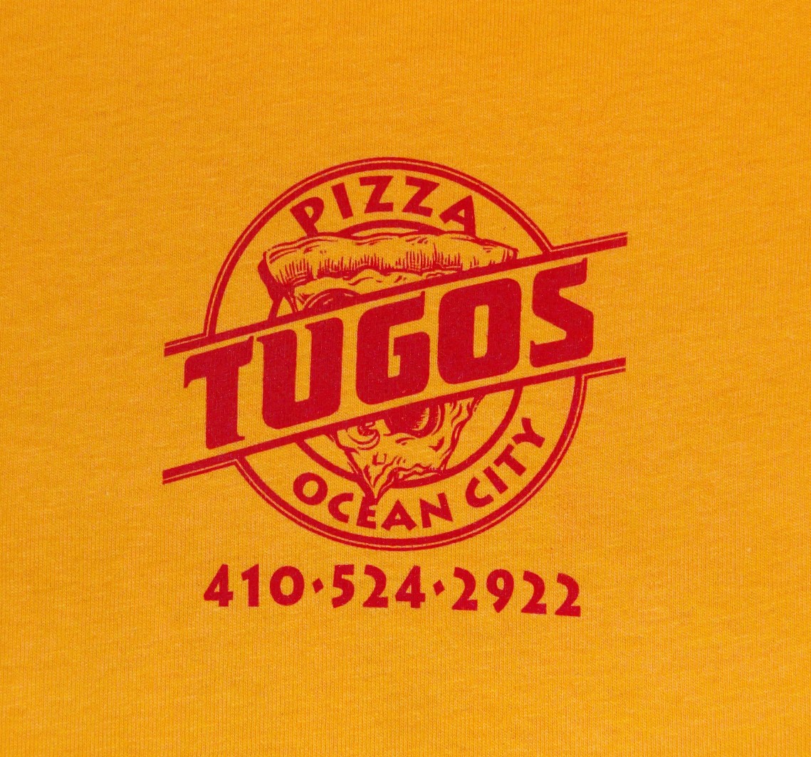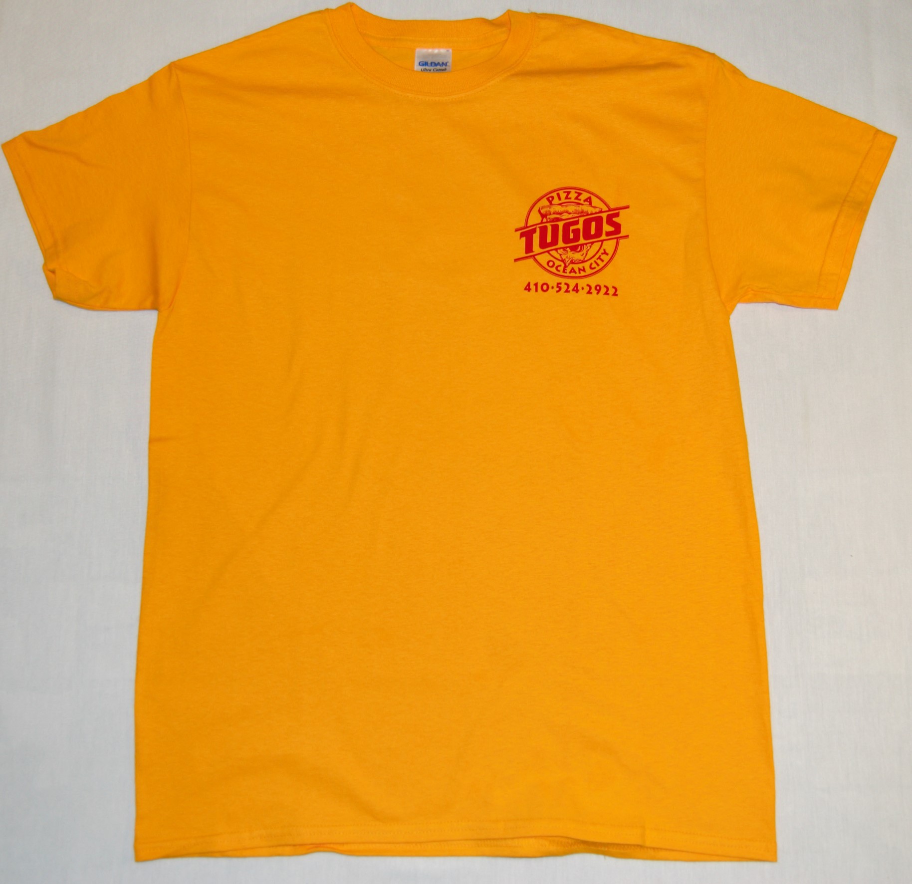 Our Pizza Tugos Crew T-Shirt is a yellow t-shirt featuring the Pizza Tugos logo printed in red ink on the chest and on the back.